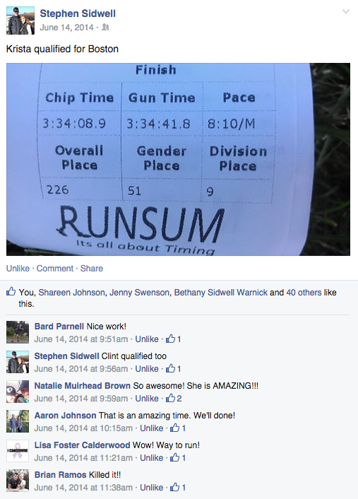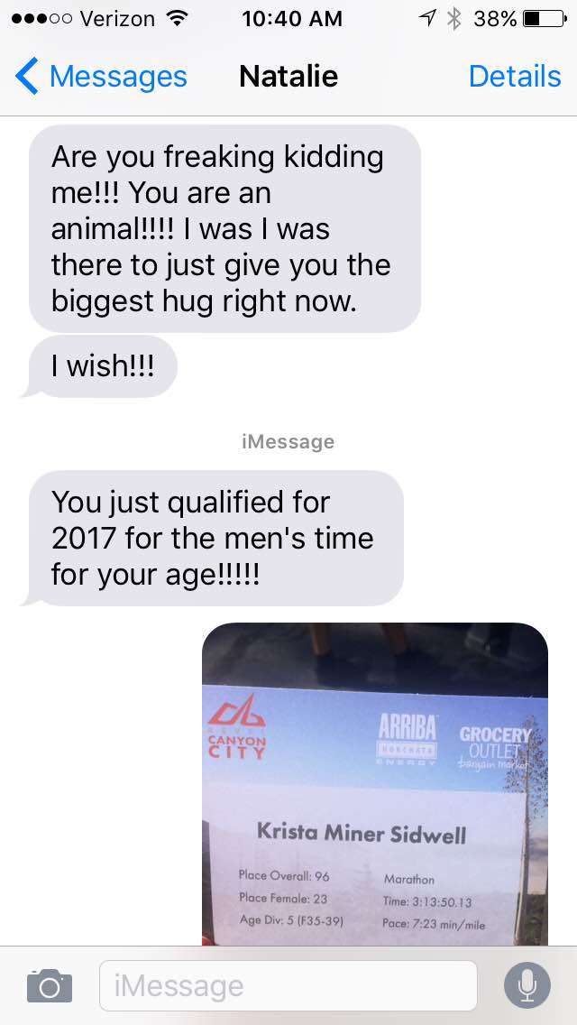 I hear my family but don’t ever really see them. All six of them were lined up just before the turn for the finish line. I heard them yelling, “Go, Krista! Go!” And it touched my heart. I was giving it all I had at that point. I felt like I was running through mud, but I just kept pushing. The finish line was now in sight. The clock read 3:03 something. What?? 3:03?? But I just passed the 3:05 pacer? I hadn’t known that he was coming in under time.