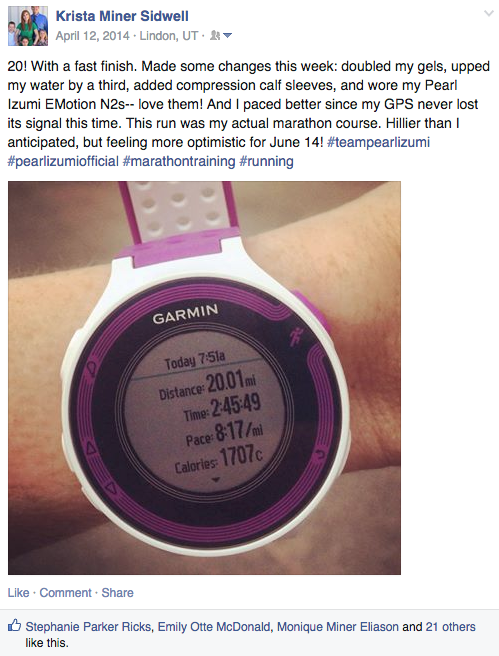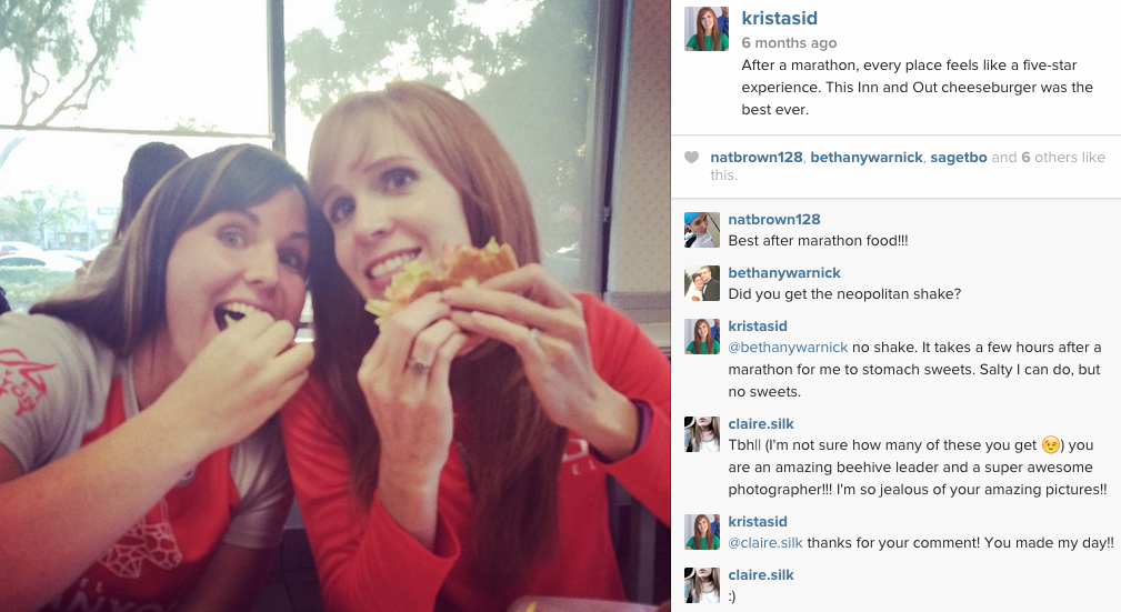 At some point, either mile 24 or 25, I’m not sure now, I was REALLY fighting stopping and walking for a bit and I suddenly could visualize my friend, Natalie, running right beside me. It was almost like an apparition it was that real. She was yelling at me–in loving Natalie style–“Don’t you stop!! You can’t walk now. Just keep going! Don’t stop!” She ran with me. I didn’t stop.