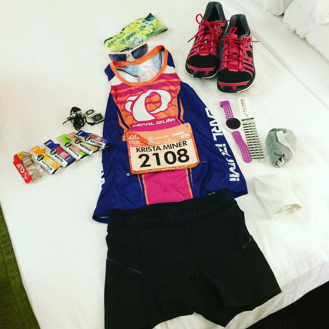 I prepared my gear bag that I was taking to the top with my 2:59 pace band (gave myself some rest-stop minutes to achieve my 3:05 goal), Base Salt Performance salt vial, my pre-race and post-race recovery Maurten 320 drink, a Clif Bar, my course notes, some Ibuprofen, water and my six nutrition gels I would need for the course.