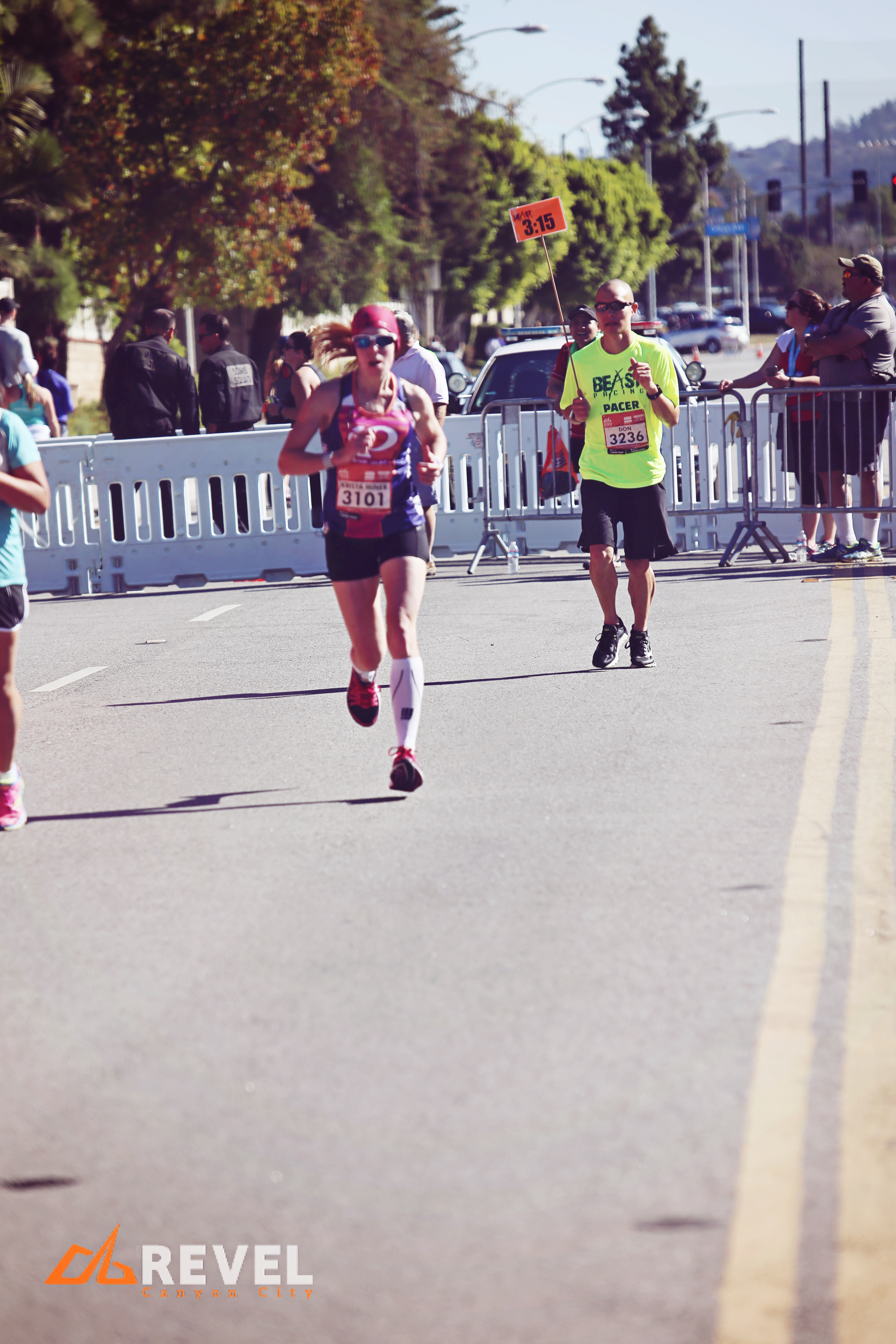 So, I’m running along and the 3:05 pacer runs by me. What?? I look at him and mention how I had been trying to find him. He had stopped to use the bathroom at the most recent water stop and was running to catch up to the 3:05 group. I followed him and finally landed myself with the 3:05 runners. All male except for one other female by me.