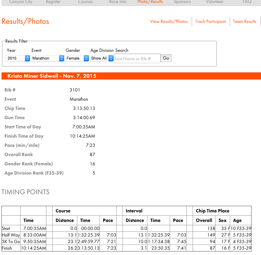 I hit a group of rowdy spectators and they saw that I was close to the 3:05 pacer, and nearing the finish line. “Go Timex!! Pass the Pacer! Pass the Pacer!” The crowd must have felt my goal; must have known that I needed to get in front of the 3:05 pacer to make my goal. I wasn’t looking at my watch anymore, just running as fast I could. Their cheering cheered me and I was able to find some kick. Pass the pacer, Krista. Pass the pacer.
